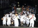 触番の出発を終えた宮司は、 二本の松明に先導され拝殿前の石段まで神輿をお迎えする。